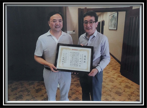 2013年9月 向井和司さん(右:シャープエナジー事業(yè)部本部長)がソーラーギガに感謝の意を示すため、譚文華さん(左:錦州ソーラーギガ會長)に感謝狀を送りました。