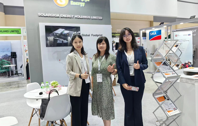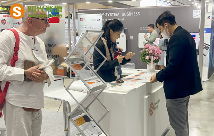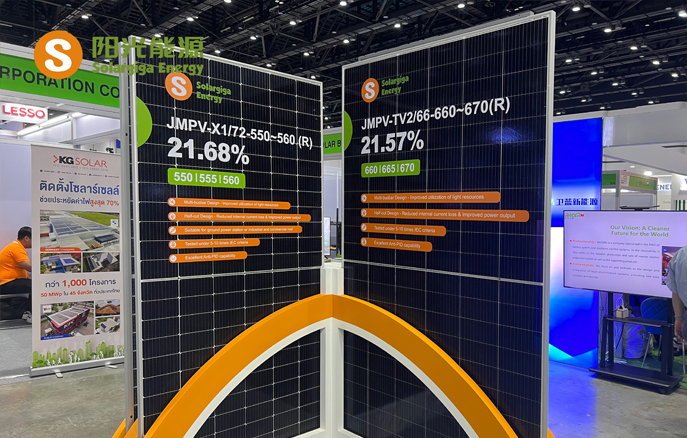 本屆展會,陽光能源帶來了1款N型組件和3款P型組件產(chǎn)品,現(xiàn)場工作人員向來訪客戶及觀眾詳細(xì)介紹了我司組件產(chǎn)品在不同場景下的實(shí)際應(yīng)用,涵蓋大型地面電站、工商業(yè)和住宅屋頂?shù)阮I(lǐng)域。值得一提的是,本屆展會展出的Giga-N系列組件基于182mm硅片,采用N型TOPCon電池技術(shù)并疊加雙面技術(shù),能夠?yàn)榻K端用戶帶來更高的收益率;此外,該款組件邊框采用聚氨酯材質(zhì),兼具優(yōu)異的力學(xué)性能和耐鹽霧、耐化學(xué)腐蝕性能,能夠應(yīng)對像泰國這種高濕高溫氣候的地區(qū),更堅(jiān)固、更安全、更可靠。