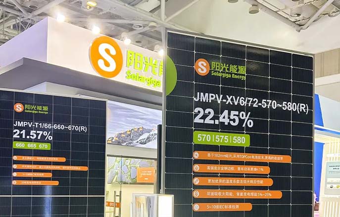 本屆展會(huì),陽(yáng)光能源重點(diǎn)展示了Giga-N系列兩款高效產(chǎn)品,分別是182 72版型雙玻和182 54版型單玻全黑組件,采用前沿的N型TOPCon技術(shù),具備高效率、高發(fā)電量、高品質(zhì)等多重優(yōu)勢(shì),能夠?yàn)榭蛻魩?lái)更高的價(jià)值。其中,182 54版型單玻全黑組件是陽(yáng)光能源面向全球分布式市場(chǎng)打造的高端產(chǎn)品之一,外觀精美,量產(chǎn)效率可達(dá)21.76%,被廣泛應(yīng)用于建筑屋頂?shù)葢?yīng)用場(chǎng)景。