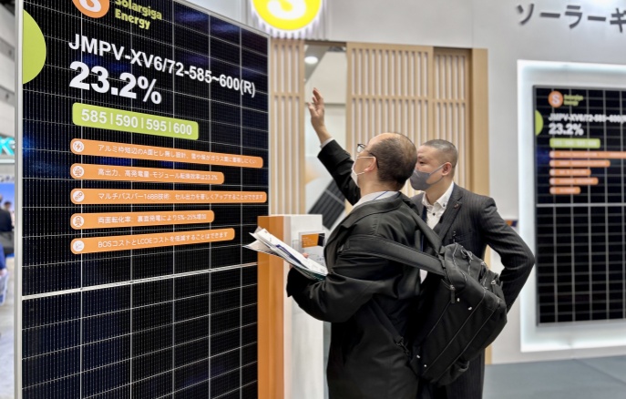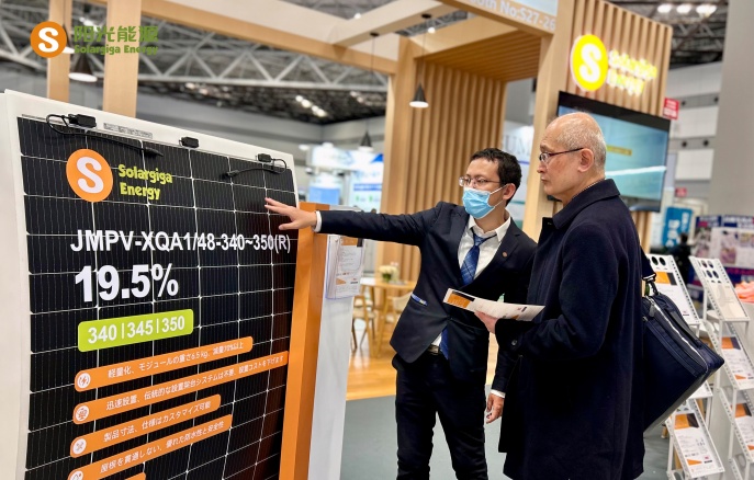 本次展會,陽光能源集中展示了公司的前沿技術(shù)和先進的光伏組件產(chǎn)品,5 款展品高度契合以小型項目為主導的日本光伏市場需求。其中一款 Giga-N 系列 48 片輕質(zhì)雙玻戶用光伏組件,采用了 N型TOPCon 電池技術(shù)搭載 210R 矩形硅片,極大地提升了發(fā)電效率,組件轉(zhuǎn)換效率提升到 23.0% ,即便在弱光環(huán)境下也能高效運作;在外觀設(shè)計方面,打造更加簡約時尚的全黑外觀,適用于各類建筑風格。