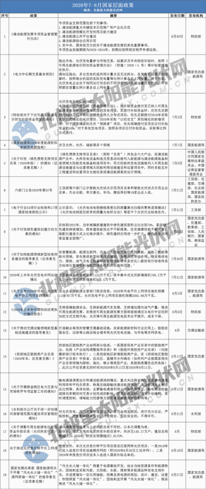 國家層面,7、8月份共發(fā)布19項(xiàng)光伏政策,涉及可再生能源電價(jià)補(bǔ)貼、光伏競/平價(jià)政策、電力市場交易、BIPV、風(fēng)光儲(chǔ)一體化項(xiàng)目等多個(gè)方面。