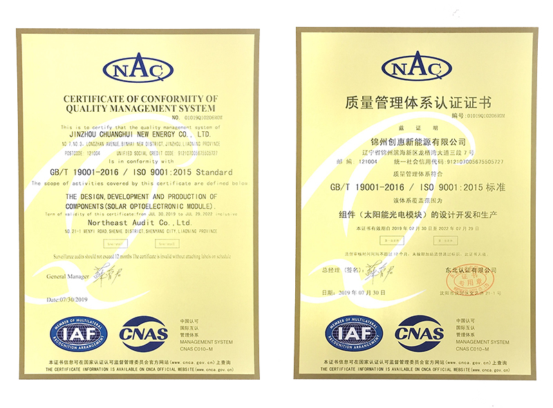 2019年7月30日,錦州陽光能源有限公司全資子公司錦州創(chuàng)惠新能源有限公司喜獲品質(zhì)體系認(rèn)證證書